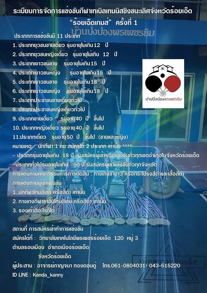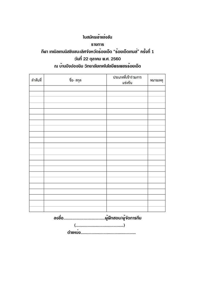 | ใบสมัครเข้าแข่งขัน กีฬา เทเบิลเทนนิสชิงความเป็นเลิศจังหวัดร้อยเอ็ด | ดาวน์โหลด | 0.04 MB | 116 | 27 ต.ค. 60 |